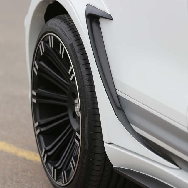 不過有別于一般高價車款應(yīng)該有的沉穩(wěn)特性,Wald從設(shè)計之初就是要將Cayenne打造成路上最受矚目的焦點(diǎn),因此可以看到車頭極為復(fù)雜的線條設(shè)計開始向后延伸,而仿佛利爪的發(fā)動機(jī)蓋則是延續(xù)Wald Porsche Cayenne 958殺氣騰騰的風(fēng)格,讓人第一眼見到實(shí)車就可以感受到不寒而栗的肅殺氣息,而擁有如此霸氣十足的車頭造型當(dāng)然要有寬體配合才算完整,因此除了前后保桿也采用寬體設(shè)計之外,前后葉子版向外刻意延伸的寬體更是完整將Wald Black Bison Edition的概念給清楚呈現(xiàn)。