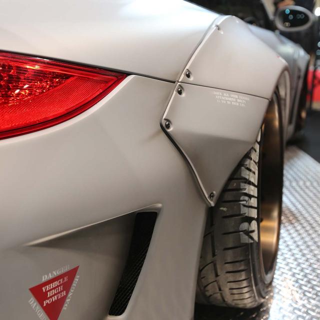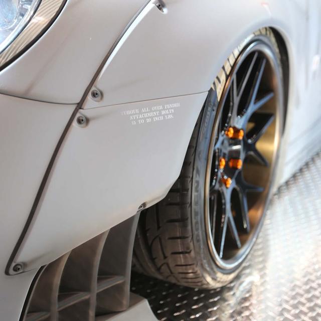 除了切除原有鈑件限制之外,透過寬體套件使得輪框得以大幅向外延伸,為了方便日后維修的便利性,原本傳統(tǒng)的鉚釘設(shè)計(jì)也被改為對(duì)鎖六角螺絲,粗曠線條之中帶有特殊的視覺效果能讓橫向延伸更加威猛,而采用19~20寸Forgiato鍛造輪轂,依照車型不同采用特訂負(fù)ET值的鋁圈,除了可有效增加胎圈寬度設(shè)定之外,也可有效避免底盤額外增加Spacer。  | 前后呼應(yīng)的寬體外觀設(shè)計(jì)恰好能夠符合整體協(xié)調(diào)性。 |