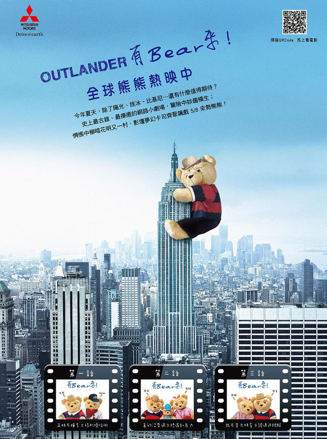 創(chuàng)意廣告總是讓人看了會(huì)心一笑,再搭上優(yōu)質(zhì)產(chǎn)品更是讓消費(fèi)者過(guò)目不忘。 中華三菱長(zhǎng)期以來(lái)所推的優(yōu)質(zhì)車(chē)款深獲消費(fèi)者喜愛(ài),而隨之不斷創(chuàng)新的行銷(xiāo)手法更打造出許多讓人瑯瑯上口極富記憶度的廣告。 繼2013年末,哪里都沒(méi)去過(guò)的小敏一句句「好?。 冠A(yíng)得臺(tái)灣4A創(chuàng)意獎(jiǎng)并引發(fā)網(wǎng)友一陣Kuso風(fēng)潮后,今年中華三菱創(chuàng)意行銷(xiāo)再發(fā)威,推出「有Bear來(lái)」網(wǎng)絡(luò)小劇場(chǎng),以超萌的熊演員擔(dān)綱并擔(dān)任MITSUBISHI OUTLANDER代言人,推出幽默詼諧的系列影片。 上市以來(lái)以高科技安全性及高乘載性空間著稱(chēng)的SUV休旅車(chē)OUTLANDER,不僅以其優(yōu)越的產(chǎn)品實(shí)力深受消費(fèi)者推崇,連萌翻天的網(wǎng)絡(luò)劇場(chǎng)主角熊偶都為之著迷,因此本次『熊偶x OUTLANDER』系列影片將于5月8日起開(kāi)播,相信其創(chuàng)新的廣告創(chuàng)意將再度引起網(wǎng)友瘋狂點(diǎn)閱及分享。