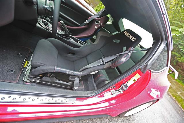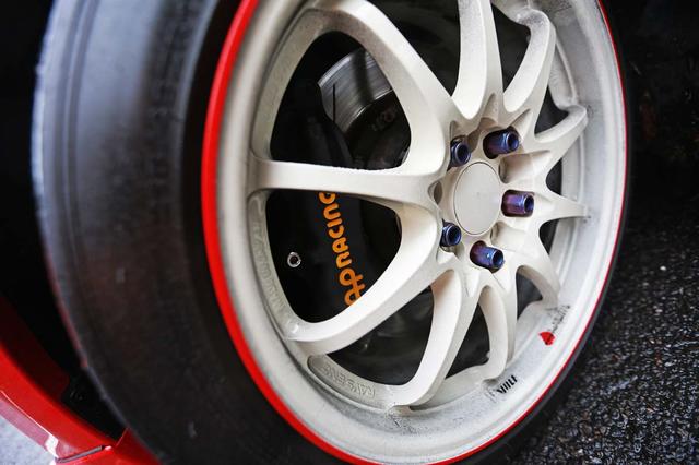 車輛必須追求動力與底盤的均衡性,因此曹總監(jiān)也針對底盤部分下了不少工夫。 改裝Tein SRC外掛氮氣瓶的避震器,能對應(yīng)賽道激烈駕駛所需的衰減力與作用行程設(shè)定;剎車部分改裝知名AP Racing對向多活塞剎車組,并換裝J??C BRAKE剎車皮增強摩擦系數(shù)與耐高溫性,鋁圈為17寸Rays CE28N制品,輪胎為215/45 ZR17規(guī)格,白色鋁圈搭配紅色車身,真是相得益彰。