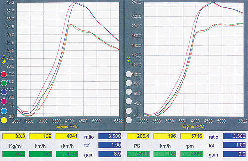 此為馬力的曲線圖,與上方提高增壓值后的曲線相比,3500rpm過后則是有相當劇烈的轉變,只不過原廠輪的出風量只要超過4500rpm后就已達到界線。左邊的扭力曲線圖可看到,4000rpm過后的扭力差別,無補正下的紀錄原廠為205.4ps/33.7kgm,增壓值提升為248.8ps/40.2kgm。 |