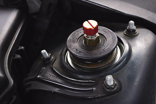 Aragosta的硬橡皮避震器上座,一般街道使用也不會產(chǎn)生擾人的異音,金色的旋鈕則是避震器衰竭力的調(diào)整裝置。 |