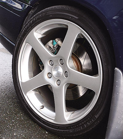 鋁圈設計得相當簡單,7.5J×18的五爪式樣Kahn Type RS,輪胎為普利司通RE050A的225/40-18。 |