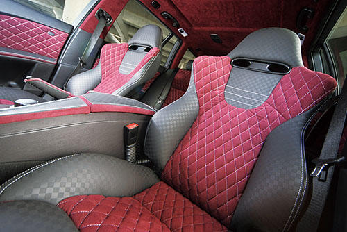 外觀充滿了強(qiáng)烈的沖擊感,內(nèi)飾的配色也非常精采:前后座椅、門飾板、窗柱、以至于天篷全部都縫制了皮革,而且這可不是普通的工法,酒紅色的部分有針腳編織的風(fēng)格,光滑的黑色皮革則施以沖壓和方格紋路的加工。