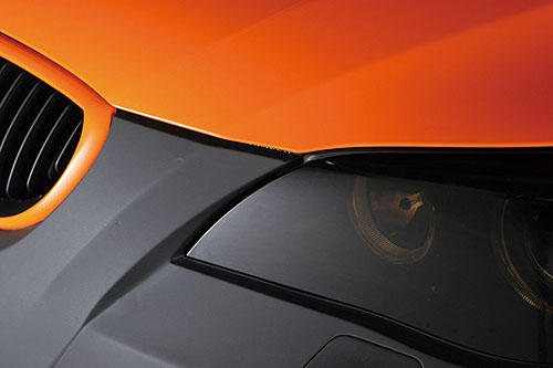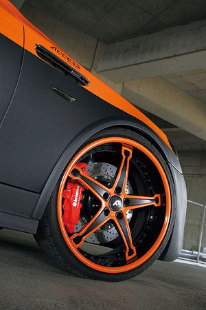 | 側(cè)裙經(jīng)過Hamann的加工。目光隨著車側(cè)的橘色線條游走,一直連到車底都一氣呵成、非常流暢。 |