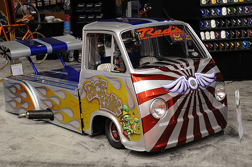 沒想到美國也會(huì)出現(xiàn)這種小貨卡,經(jīng)過Red's Hydraulics的大幅度改造后,化身成為一部可跑、可跳的直線加速車。可以跳?是的,Red's Hydraulics是一家專攻液壓懸掛系統(tǒng)的改裝廠,也就是臺(tái)灣俗稱的跳跳車,這部小面包除了東洋風(fēng)的車身彩繪之外,懸掛便裝上了電磁閥控制的液壓懸掛系統(tǒng),除了能夠讓車身降到貼地之外,整部車還可以跳到完全騰空。