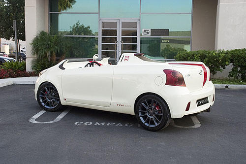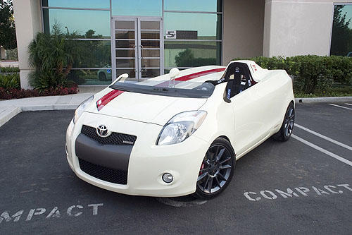 居然把車頂給切了,F(xiàn)ive Axis的大膽行徑在此次SEMA Show完全顯露無疑。這部Yaris Club的設(shè)計(jì)概念取材自'60年代賽車「Toyota 7」,以三門車型為基礎(chǔ)而改裝成為單座敞篷跑車,白色涂裝與紅色條狀彩繪就如同「Toyota 7」的翻版,駕駛座后方甚至還裝了整流罩,是一部讀者會(huì)感到興趣的改裝范本。