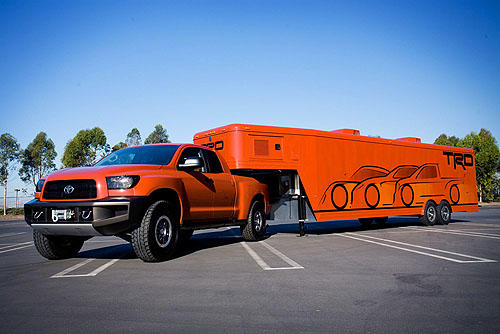 讓人驚訝的重裝貨卡,這部四輪驅(qū)動(dòng)的Tundra在強(qiáng)大的越野功能之外,車上更配置了TRD制作的5.7升V8機(jī)械增壓發(fā)動(dòng)機(jī),借由500匹馬力的強(qiáng)悍功率輸出,該廠甚至還設(shè)計(jì)一部長達(dá)28英尺的賽車運(yùn)輸專用拖車,廣泛的用途與強(qiáng)大性能展現(xiàn)Toyota欲討好老美的企圖心。