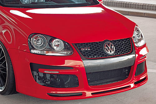 黑色深凹的保桿開口部分與20寸的Brombacher輪轂呼應,在色調(diào)上訴求紅黑雙色,強調(diào)了GTI的跑格,設計非常精悍。 |