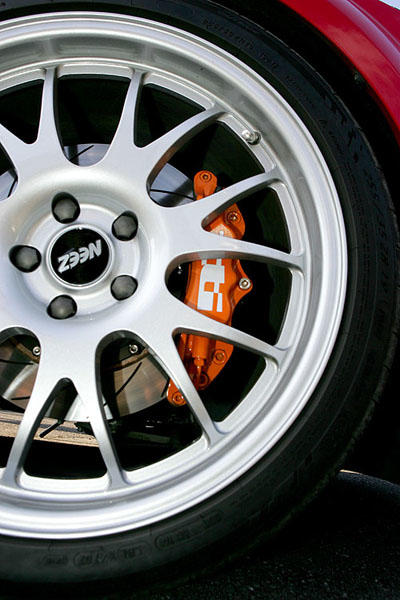 跑車車型加上354hp的超高性能,底盤的改裝不僅提升穩(wěn)定度,也讓行車更加放心。Bilstein最頂級(jí)的避震器制品:PSS10,倒叉的筒芯設(shè)計(jì)增加路面的回饋反應(yīng),同時(shí)提升了彎中過(guò)高的穩(wěn)定性,Hi-Low Kit讓車高恰到好處,10段軟硬可調(diào)滿足汽車使用人對(duì)于不同乘坐感的需求。改裝19寸Neez鋁圈配上Michelin頂級(jí)的Pilot Sport II跑胎,255/35ZR19的超寬規(guī)格提供絕佳的抓地性能,最特別的是剎車的部分,改裝由TTI近期才推出的對(duì)向六活塞剎車系統(tǒng),套件中包含兩片式通風(fēng)碟、剎車皮與金屬油管,給予更充足的制動(dòng)力道,橘色的涂裝也有畫(huà)龍點(diǎn)睛的效果喔!