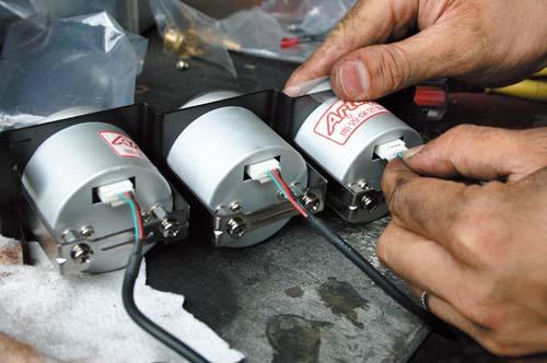 用有折角的鐵架,將三顆表逐一固定在表座上,在鎖之前要試一下折角角度是否能夠有效卡住儀表。 |