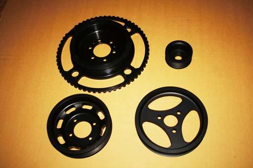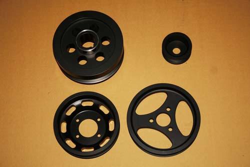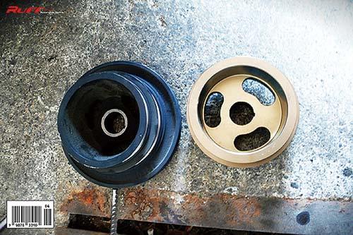 在眾多內功修為中,輕量化普利盤是最入門且具功效的一項基礎,不過早期有「練過」這項功夫的車友可能都知道,過輕的普利盤會造成馬力喪失,即便轉速攀升很快,但力道卻僅在一、二檔而已。而曲軸普利盤的功能,除了帶動發(fā)電機、水泵浦、方向機及冷氣壓縮機之外,還有吸收發(fā)動機共振(Harmonic Vibration Frequency)的吸震功能(Damper),所以曲軸普利盤不能過度輕量化。事實上,輕量化普利這件事,BMW原廠早在M50進化成M50tu就做過,透過曲軸普利適當的減重,能改善冷氣開啟后的重拖問題!可惜M50tu的曲軸普利盤與M50及M52是不通用的,所以Ruff針對M50和M52設計了專用輕量化普利盤。至于方向機、水幫浦、發(fā)電機這三者的普利盤,則不必像曲軸普利得考慮「吸震性」及「慣性能量累積(拉極速除汽缸所產生的爆炸力,曲軸旋轉的慣性力也很重要)」,因此這三件加速普利只要重量愈輕,使負荷變小,加速就能愈快。
