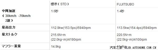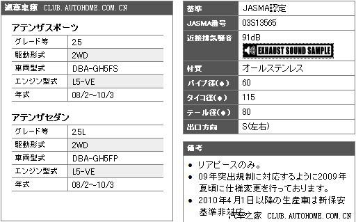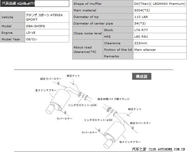 | 睿翼涉及5000元以上的改裝,除了輪轂、輪胎,就是排氣尾段了。本篇盡可能收集睿翼可用的排氣尾段,以餐車友。 各尾段詳細(xì)分貝值等數(shù)據(jù)持續(xù)更新中。 睿翼排氣尾段集錦------REMUS 篇 改裝品牌:REMUS 歐洲排氣管大廠。REMUS是由馳名世界的跑車排氣管專家MR. Otto Kresch和MRS.Angelika Kresch所創(chuàng)建的。REMUS是羅馬城創(chuàng)建者的名字,REMUS以此為名,即取其開拓、創(chuàng)新,期望位居行業(yè)領(lǐng)軍地位之意。相傳REMUS從小被野狼養(yǎng)大成人,因此狼頭就成為REMUS的企業(yè)標(biāo)志。 適用車種:Atenza GH,睿翼,new mazda6 改裝項(xiàng)目:尾段 商品型號(hào):456508 0570L、456508 0570R 尾管直徑:Φ102mm 具體參數(shù):remus.at/media/productspdf/4565080570R.pdf 連結(jié)網(wǎng)頁:remus.at/cms/cms.php?sid=pisem4dvbuenjh9eo1hfncgts7 ![]() ![]() ![]() ![]() ![]() 睿翼排氣尾段集錦------Odula 篇 改裝品牌:Odula 日本改裝廠 適用車種:Atenza GH,睿翼,new mazda6 改裝項(xiàng)目:尾段 商品型號(hào):アテンザスポーツワゴン V-specマフラー 尾管直徑:Φ100mm 聲浪試聽:odula.com/sound/IC_A_020.MP3 連結(jié)網(wǎng)頁:odula.com/ 配合原廠后下吧,尾管為楔形設(shè)計(jì): ![]() ![]() ![]() [ 本帖最后由 天涯3568 于 2010-10-19 22:39 編輯 ] 睿翼排氣尾段集錦------TRUST 篇 改裝品牌:TRUST 適用車種:Atenza GH,睿翼,new mazda6 改裝項(xiàng)目:尾段 商品型號(hào):GReddy Comfort Sports GT Slash 尾口直徑:Φ115mm(目前已知睿翼雙出排氣尾管口徑最粗的) 尾口最大噪音:91db 參數(shù):trust-power.com/spec_swf/01exhaust/Muffler_mazda.swf 連結(jié)網(wǎng)頁:trust-power.com/01exhaust/cs_gts.html ![]() ![]() [ 本帖最后由 天涯3568 于 2010-10-19 22:40 編輯 ] 睿翼排氣尾段集錦------AutoExe四出篇 改裝品牌:AutoExe 適用車種:Atenza GH 改裝項(xiàng)目:四出尾段 尾口直徑:Φ80mm*2 容量:10.7L*2 重量:8.6KG*2 商品型號(hào):MGH8Y50,需要配合MGH2400,也可不配,但要求手工切割后下巴時(shí)邊緣要齊整。 換裝作業(yè)參考時(shí)間:1小時(shí) 連結(jié)網(wǎng)頁:autoexe.co.jp/ 聲浪音頻:autoexe.co.jp/products/STAINLESSMUFFLER/mgh8550sound.mp3 ![]() ![]() ![]() ![]() 也可不裝那個(gè)后裝飾罩MGH2400,但要切割好后下巴,效果圖: ![]() ![]() 睿翼排氣尾段集錦------AutoExe雙出篇 改裝品牌:AutoExe 適用車種:Atenza GH 改裝項(xiàng)目:雙出尾段 商品型號(hào):MGH8500 換裝作業(yè)參考時(shí)間:0.5小時(shí) 連結(jié)網(wǎng)頁:autoexe.co.jp/car/Atenza(GH)/GH.html#Anchor-58971 聲浪音頻:autoexe.co.jp/products/STAINLESSMUFFLER/PremiumTail/mgh8510.mp3 ![]() ![]() ![]() ![]() ![]() ![]() ![]() ![]() [ 本帖最后由 天涯3568 于 2010-10-22 01:06 編輯 ] 睿翼排氣尾段集錦------柿本改 KRnoble Ellisse 篇 改裝品牌:KRnoble Ellisse 適用車種:Atenza GH 改裝項(xiàng)目:雙出尾段 產(chǎn)品材質(zhì):不銹鋼 尾口直徑:115*80mm(橢圓形) 尾口附近最大噪音:89db 商品型號(hào):Z51318A 連接網(wǎng)頁:kakimotoracing.co.jp/image_z51318.html ![]() ![]() ![]() ![]() ![]() ![]() 附屬配件:GK050206 ![]() ![]() [ 本帖最后由 天涯3568 于 2010-10-26 11:15 編輯 ] 睿翼排氣尾段集錦------HKS LEGAMAX Premium 篇 改裝品牌:HKS 適用車種:Atenza GH 改裝項(xiàng)目:尾段 商品型號(hào):LEGAMAX Premium 32018-AZ007 面世日期:2008年01月 尾管直徑:Φ110mm 尾口噪音:左80db、右81db 連結(jié)網(wǎng)頁:hks-power.co.jp/ 聲浪音頻:hks-tv.com/watch/?watch=76 技術(shù)參數(shù):hks-power.co.jp/db/muffler_detail.aspx?N_ID=1&F_ID=11189 ![]() ![]() ![]() ![]() [ 本帖最后由 天涯3568 于 2010-10-26 11:25 編輯 ] 睿翼排氣尾段集錦------Fujitsubo SEDALIS 藤壺 篇 改裝品牌:Fujitsubo 藤壺 對應(yīng)系列:SEDALIS 適用車種:Atenza GH 商品型號(hào):460-43521 尾口直徑:110×90φ 連結(jié)網(wǎng)頁:fujitsubo.co.jp/prods/detail/000000000000001841/00000000000000004178/00001242 中國官網(wǎng)資料:fujitsubo-china.com.cn/db_picture/pro7/201007151842184680.pdf ![]() ![]() ![]() ![]() ![]() ![]() ![]() ![]() 加速、功率、扭力、重量參數(shù): 兼顧低速扭矩的平衡型尾段,4100轉(zhuǎn)時(shí)最大扭矩僅損失5.5N.m(個(gè)人評價(jià)) ![]() 噪音: ![]() 本人安裝效果圖: ![]() ![]() [ 本帖最后由 天涯3568 于 2010-10-26 11:31 編輯 ] 睿翼排氣尾段集錦------GP SPORTS EXAS EVO Tune 篇 改裝品牌:GP SPORTS 適用車種:Atenza GH 改裝項(xiàng)目:尾段 面世時(shí)間:2008年01月 尾段附近最大噪音:93db,建議喜歡聽雷聲的安裝。 材質(zhì):SUS304,尾口鈦尾。 尾口直徑:90φ 商品型號(hào):EXAS EVO Tune 連結(jié)網(wǎng)頁:gpsports.co.jp/exa/evt.html 聲浪試聽(非睿翼,有中段):v.youku.com/v_show/id_XMjE1OTk2NzQw.html [隨箱附件] JASMA認(rèn)證證書 使用說明書 墊片,螺栓和螺母等 六角扳手一個(gè) 貼紙 ![]() ![]() ![]() ![]() ![]() ![]() ![]() ![]() [ 本帖最后由 天涯3568 于 2010-10-29 17:15 編輯 ] 睿翼排氣尾段集錦------臺(tái)灣省手工雙出尾段篇 ![]() ![]() 睿翼排氣尾段集錦------臺(tái)灣省賓川雙出尾段篇 ![]() 睿翼排氣尾段集錦------A Spec 篇 A Spec Products 于2001年在美國洛杉磯建立,旨在為改車的顧客提供真正高品質(zhì)的性能提升產(chǎn)品.A Spec 的創(chuàng)辦人熱愛賽車, 對汽車性能提升經(jīng)驗(yàn)豐富, 對改裝部件的質(zhì)數(shù)要求嚴(yán)謹(jǐn). A Spec 在2003年建立了自己的生產(chǎn)廠房, 將我司的改車技術(shù), 品質(zhì)要求實(shí)現(xiàn)在產(chǎn)品之上. A Spec 活躍于競技賽事,經(jīng)常把自家的新產(chǎn)品在實(shí)戰(zhàn)的環(huán)境下進(jìn