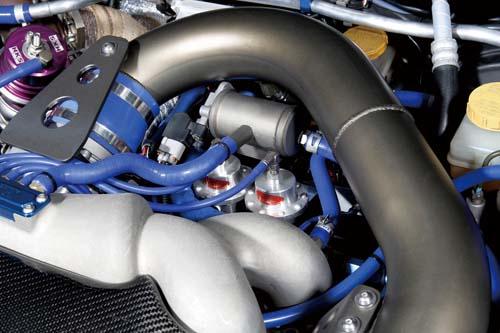 發(fā)動(dòng)機(jī)室中除了顯眼的Cosworth 進(jìn)氣岐管外,巨大的HKS T04Z渦輪機(jī)更是相當(dāng)顯眼,而為了隔絕發(fā)動(dòng)機(jī)室內(nèi)的熱源,手工碳纖維集氣箱更是可以直接出售了啦 |