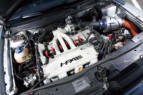 Golf Mk4 R32所搭載的VR6發(fā)動機(jī),已有10.5:1的高壓縮比,想讓動力輸出大幅提升,外掛增壓器確實是最快的方式,但是需注意的問題就跟BMW M-Power改裝機(jī)械增壓一樣,增壓值不宜過高以免發(fā)動機(jī)損壞。此車主選擇知名VF機(jī)械增壓品牌,屬于葉片式設(shè)計擁有小體積的優(yōu)點,這對發(fā)動機(jī)室密密麻麻的R32來說 ??十分好用,0.4bar增壓值設(shè)定算是原廠發(fā)動機(jī)的極限,推估馬力約350hp(257千瓦)已提升超過100hp以上,而這種改法與本次采訪的其它R32完全不同,另外為搭配機(jī)械增壓本體的位置,進(jìn)氣管路已經(jīng)過大幅度修改,排氣系統(tǒng)則是國產(chǎn)知名賓川排氣管手工訂制而成,極高完整度令人驚喜。 原廠6速手動擋能對應(yīng)的尾速約230km/h,距離車主希望的尾速相差甚遠(yuǎn),因此改裝HPA、尾速可對應(yīng)300km/h以上的終傳齒輪,不過此部R32的動力輸出略顯保守,所以目前尾速僅能到達(dá)290km/h。