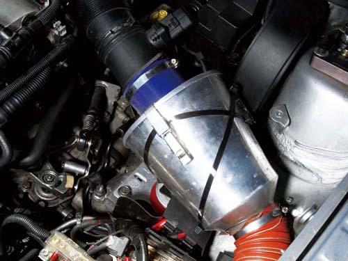 | 不僅改裝Green強(qiáng)化進(jìn)氣系統(tǒng),更在前端加上管路進(jìn)行導(dǎo)風(fēng),大量冷空氣可幫助提升發(fā)動機(jī)爆炸效率。 |