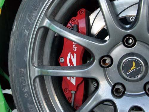換上自家的前八后四活塞剎車卡鉗制動(dòng)性絕對(duì)沒話說,但是廖董覺得在龍?zhí)顿惖郎蠅蛴镁秃?,也不一定要換到這么大的剎車卡鉗。 |