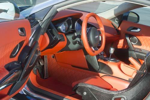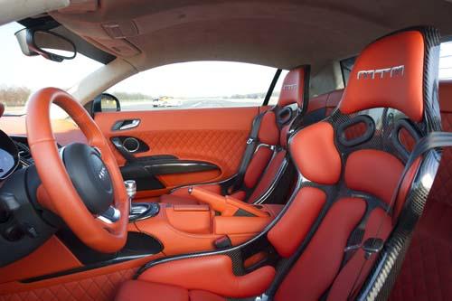 內(nèi)飾也與外觀同樣采用大膽的橘紅配色,隨處可見皮革與碳纖維融合于各飾板上,加上兩張?zhí)祭w維桶型賽車椅,使得MTM R8 V10 Biturbo有著令人愛不釋手的內(nèi)飾質(zhì)感。 |