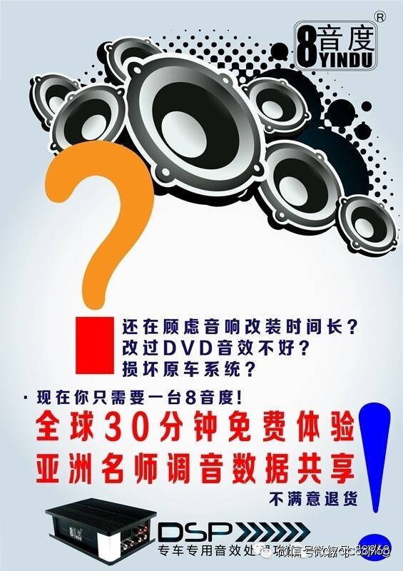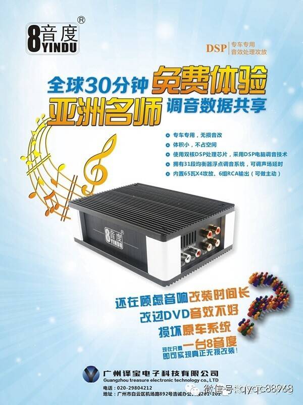 科技不斷創(chuàng)新的今天,8音度問(wèn)世了,徹底顛覆汽車音響行業(yè)的神器,8音度有31段EQ,讓您體驗(yàn)皇帝位的感覺(jué),讓您免去加功放的煩惱,免去破線的顧慮,實(shí)現(xiàn)真正的無(wú)損安裝,內(nèi)置65瓦乘4的功放,6組音頻輸出,可調(diào)延時(shí),可做主動(dòng)。10分鐘裝車,30分鐘完善一整套音響系統(tǒng),全球免費(fèi)體驗(yàn)!亞洲名師調(diào)音數(shù)據(jù)共享,效果包你滿意!8音度即將顛覆整個(gè)汽車音響行業(yè),未來(lái)讓所有人都能玩汽車音響!