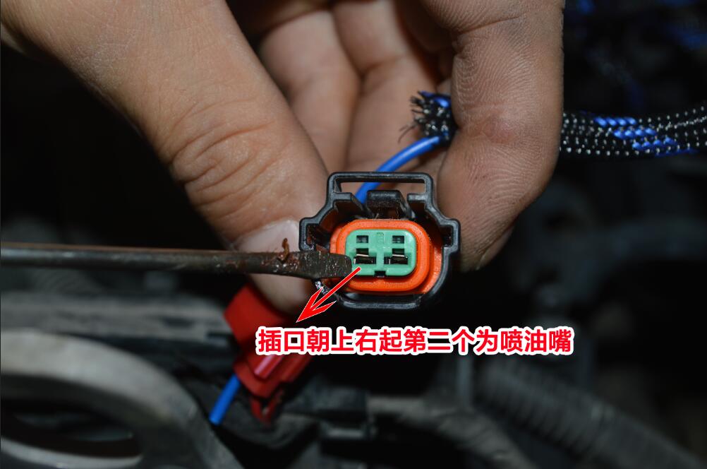 撥出其中一個噴油嘴,將萬用表黑表筆搭鐵,紅表筆測量噴油嘴上其中一條線,當(dāng)測得