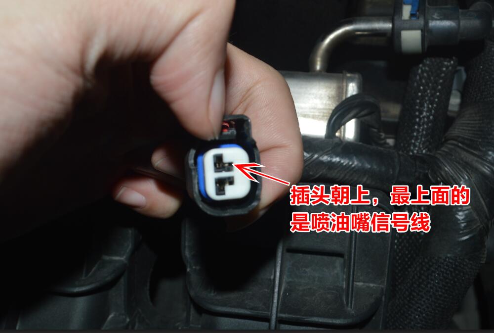 撥出其中一個噴油嘴,將萬用表黑表筆搭鐵,紅表筆測量噴油嘴上其中一條線,當(dāng)測得