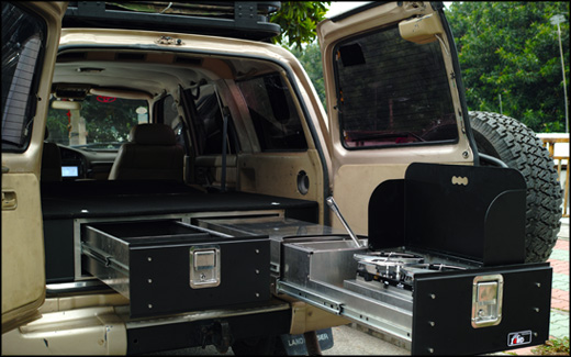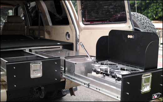 儲物抽屜與車載移動廚房間輕松互換,隨時適應(yīng)您的各種玩法,移動廚房配有全進口雙頭高山灶,折疊龍頭,進口水盆,自抽式壓力水泵,隨時無限量滿足您戶外用水需求;超大廚房操作臺面及儲存刀件空間,使您隨時隨地,享受戶外廚房帶給您的樂趣。