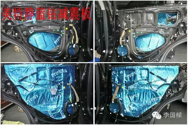貼好減震板后,再對車門門板貼上我們白白的美特靜隔音棉,瞧!這原車隔音棉在和我們家的美特靜隔音棉對比之下,盡顯暗淡失色!