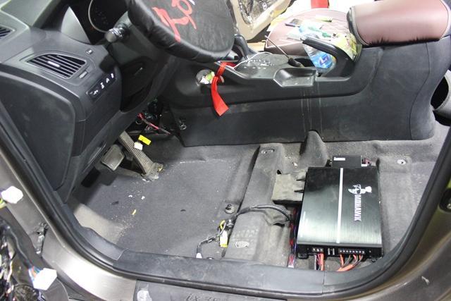 喇叭安裝完成在搭配豪客MG300.4功放。久聲技師把豪客MG300.4功放安裝在座椅下面,完全隱藏還不占空間。功放的作用就是把來自音源或前級放大器的弱信號放大,推動音箱放聲。一套良好的音響系統(tǒng)功放的作用是非常突出的。