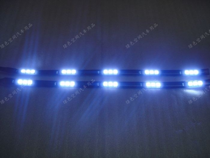 新款高亮度SMD行車燈,采用進口5050 SMD 三芯芯片(三芯就是指每個貼片燈頭里有3個芯片的,就是有3個小的光源),貼膜軟帶全密封防水設計,15個高亮度貼片型LED燈5段式分布型,漂亮、美觀、提高您愛車的檔次。
