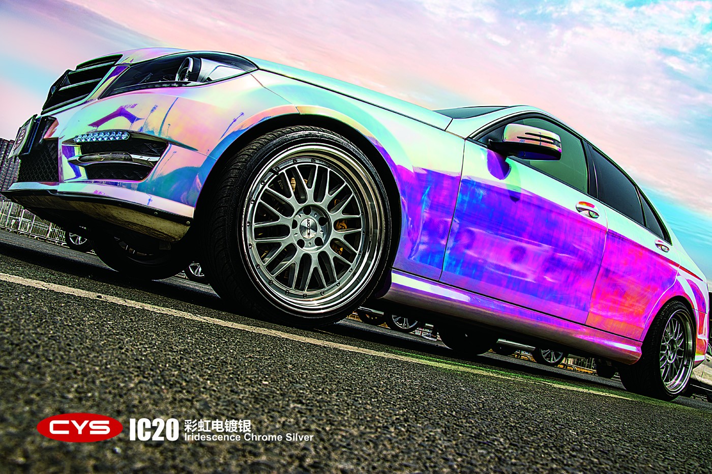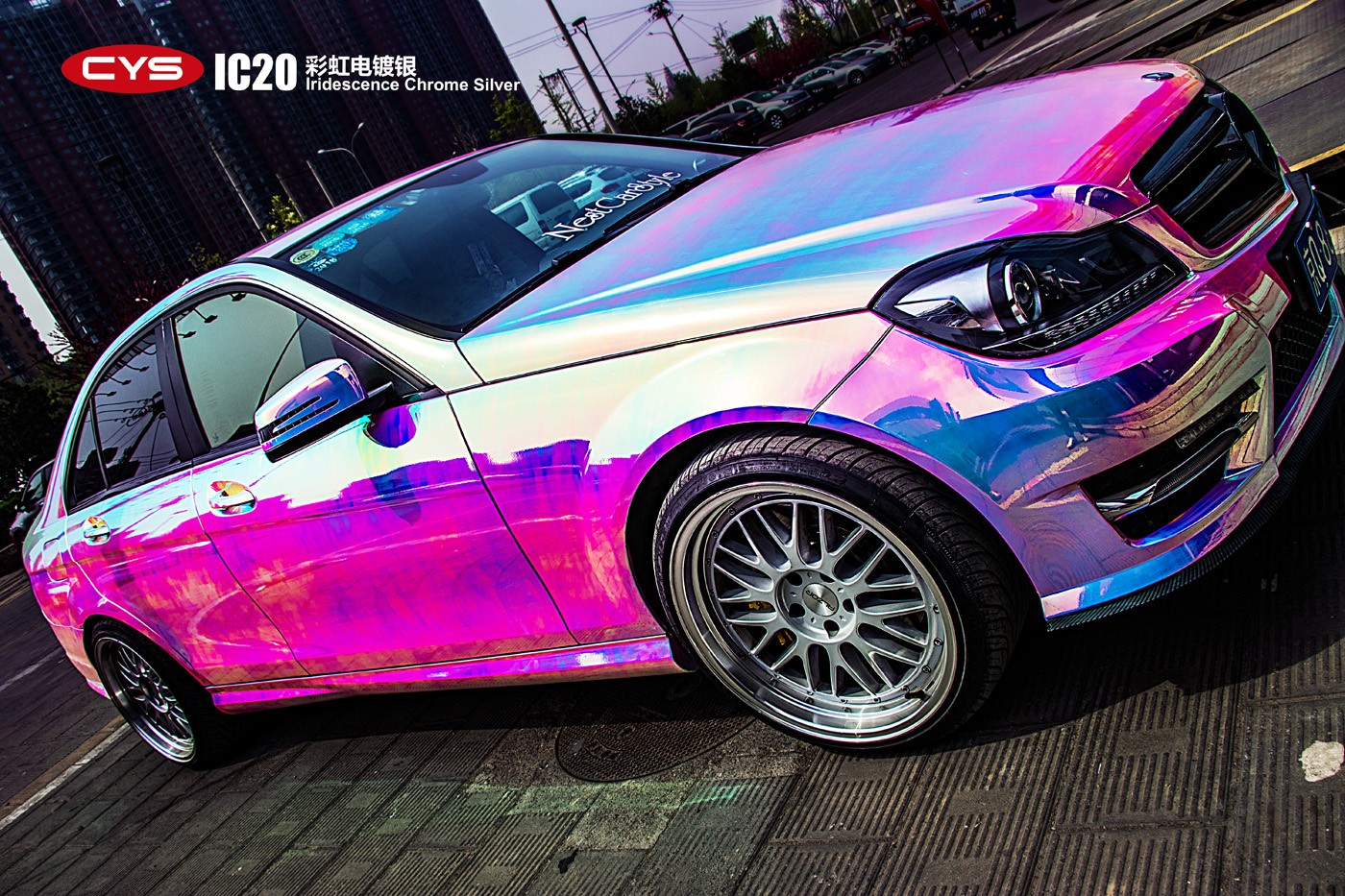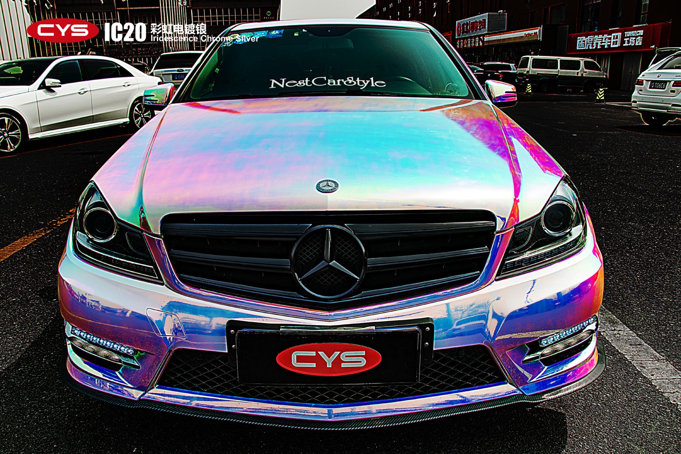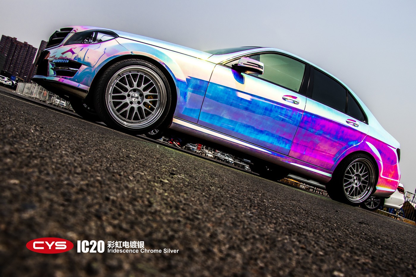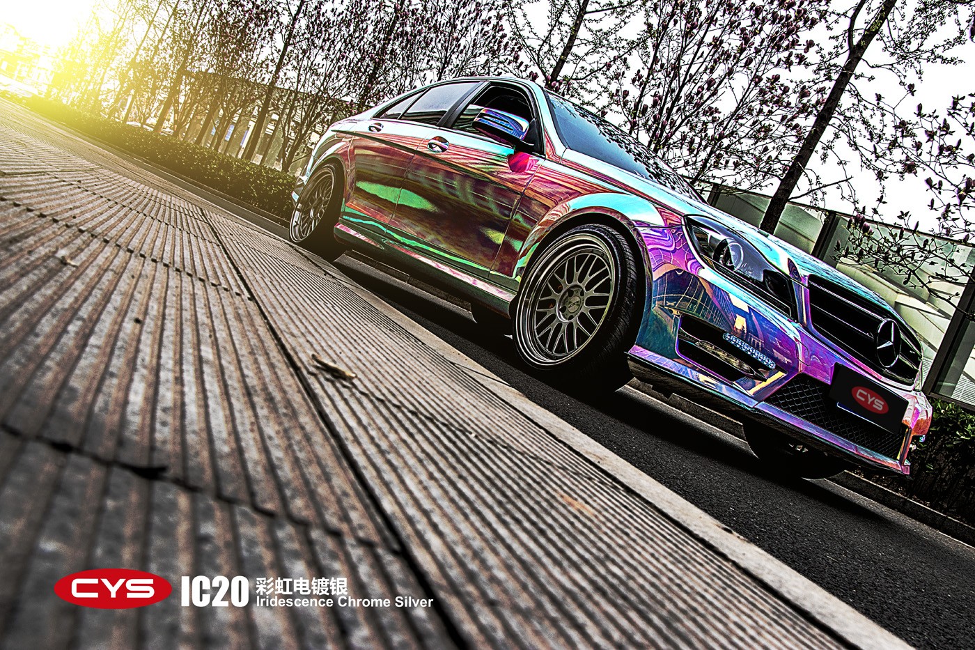 奔馳C200L彩虹電鍍銀成都車身改色貼膜
