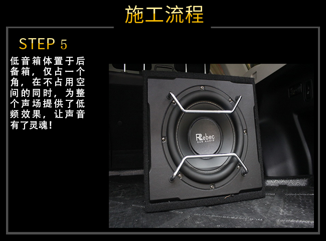 ?低音箱安裝于后備箱,不但讓后備箱保持美觀,整體的動(dòng)態(tài)效果和低頻力度也讓聲音更有提升,補(bǔ)充了聲場(chǎng)喇叭在低頻方面的不足。