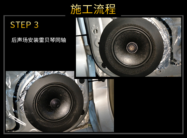 后聲場安裝雷貝琴同軸喇叭,喇叭作為輔助聲音,充分發(fā)揮自己均衡協(xié)調(diào)的特點,去補充前聲場的聲音效果,兩者相交撐起整車的聲音效果!