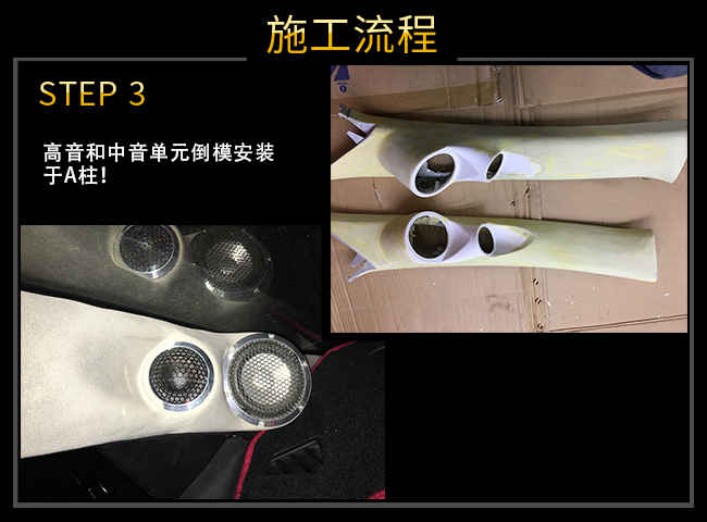 中音和高音單元倒模安裝于A柱,不同音頻單元的安裝位置、角度以固定都是經(jīng)過反復(fù)的測(cè)試之后確定的。既保證了汽車內(nèi)飾的美觀性同時(shí)又能夠保證車主能夠處于最佳的聽音位置。