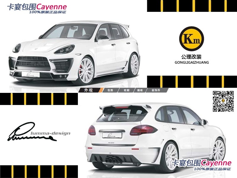 上海KM改裝俱樂部擁有歐洲MANSORY、HAMANN、LUMMA、KAHN等三十多個專門針對保時捷、路虎、奔馳、寶馬、奧迪、進(jìn)口大眾六大汽車品牌的改裝產(chǎn)品,并擁有專業(yè)的設(shè)計團(tuán)隊為高端車主提供個性化定制服務(wù)。KM將成為全國范圍內(nèi)產(chǎn)品最廣、單位面積最大、設(shè)施最齊全、檔次最高的國際超級豪車改裝旗艦店。此產(chǎn)品:Porsche保時捷卡宴全進(jìn)口原裝包圍Lumma品牌。