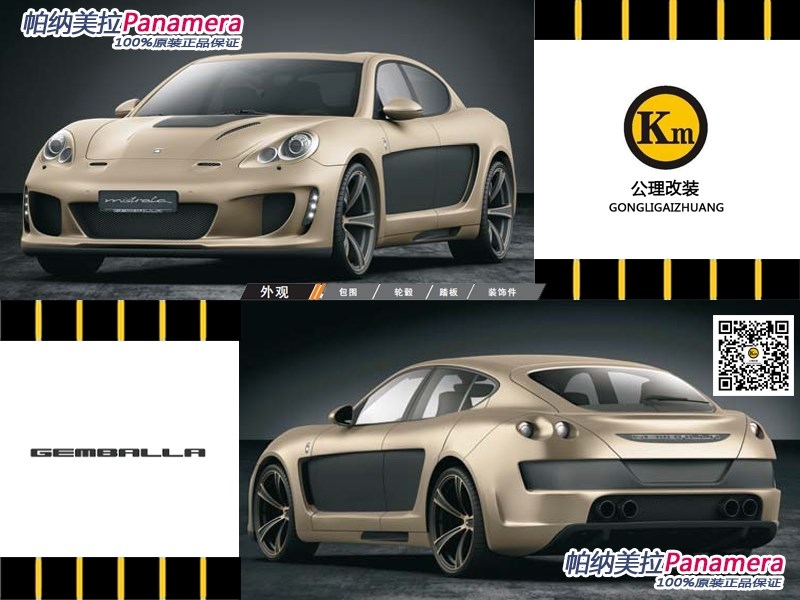 上海KM改裝俱樂部擁有歐洲MANSORY、HAMANN、LUMMA、KAHN等三十多個專門針對保時捷、路虎、奔馳、寶馬、奧迪、進口大眾六大汽車品牌的改裝產(chǎn)品,并擁有專業(yè)的設(shè)計團隊為高端車主提供個性化定制服務(wù)。KM將成為全國范圍內(nèi)產(chǎn)品最廣、單位面積最大、設(shè)施最齊全、檔次最高的國際超級豪車改裝旗艦店。此產(chǎn)品:Porsche保時捷帕納美拉全進口原裝包圍Gemballa品牌。