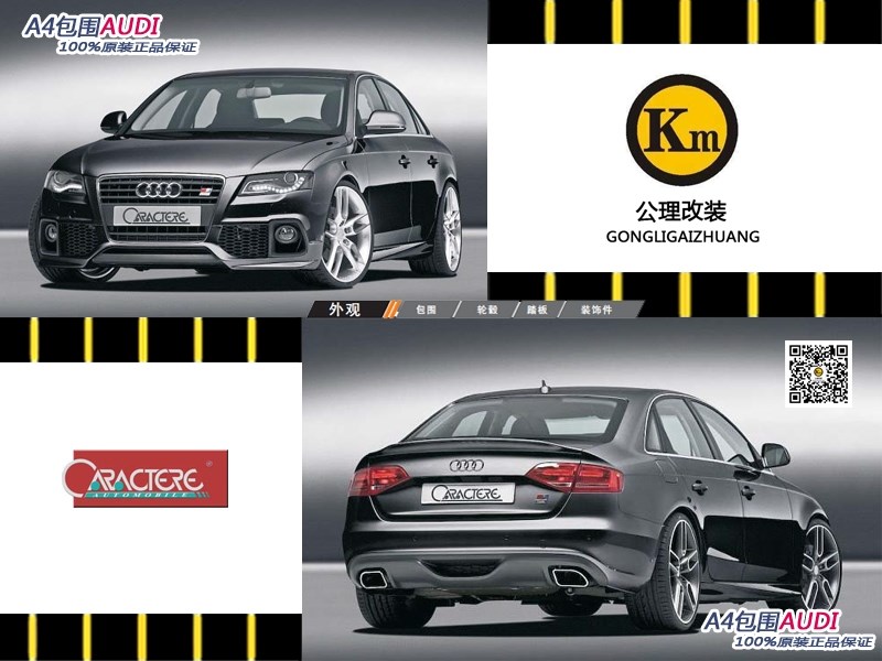 上海KM改裝俱樂部擁有歐洲MANSORY、HAMANN、LUMMA、KAHN等三十多個(gè)專門針對保時(shí)捷、路虎、奔馳、寶馬、奧迪、進(jìn)口大眾六大汽車品牌的改裝產(chǎn)品,并擁有專業(yè)的設(shè)計(jì)團(tuán)隊(duì)為高端車主提供個(gè)性化定制服務(wù)。KM將成為全國范圍內(nèi)產(chǎn)品最廣、單位面積最大、設(shè)施最齊全、檔次最高的國際超級豪車改裝旗艦店。此產(chǎn)品:AUDI A4全進(jìn)口原裝包圍Caractere品牌。