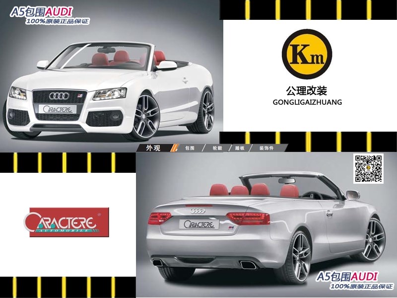 上海KM改裝俱樂(lè)部擁有歐洲MANSORY、HAMANN、LUMMA、KAHN等三十多個(gè)專(zhuān)門(mén)針對(duì)保時(shí)捷、路虎、奔馳、寶馬、奧迪、進(jìn)口大眾六大汽車(chē)品牌的改裝產(chǎn)品,并擁有專(zhuān)業(yè)的設(shè)計(jì)團(tuán)隊(duì)為高端車(chē)主提供個(gè)性化定制服務(wù)。KM將成為全國(guó)范圍內(nèi)產(chǎn)品最廣、單位面積最大、設(shè)施最齊全、檔次最高的國(guó)際超級(jí)豪車(chē)改裝旗艦店。此產(chǎn)品:AUDI A4全進(jìn)口原裝包圍Caractere品牌。