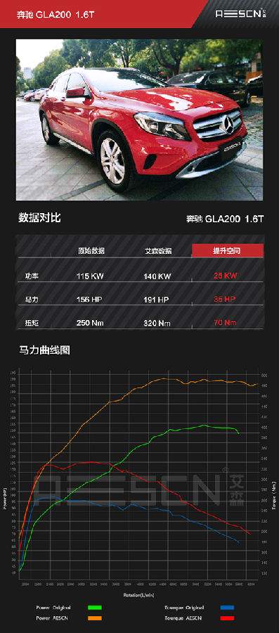 艾森發(fā)布奔馳GLA200 1.6T程序方案:一切以安全、穩(wěn)定為前提,在不損傷發(fā)動(dòng)機(jī)壽命前提下,將動(dòng)力優(yōu)化至最佳,同時(shí)符合車主的駕駛需求,性能參數(shù)如下: