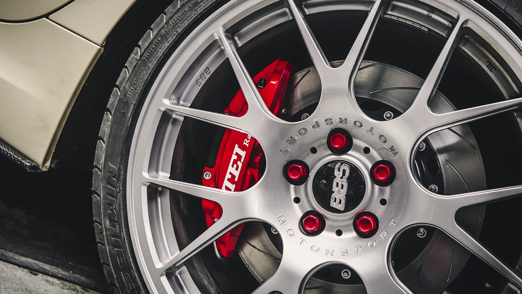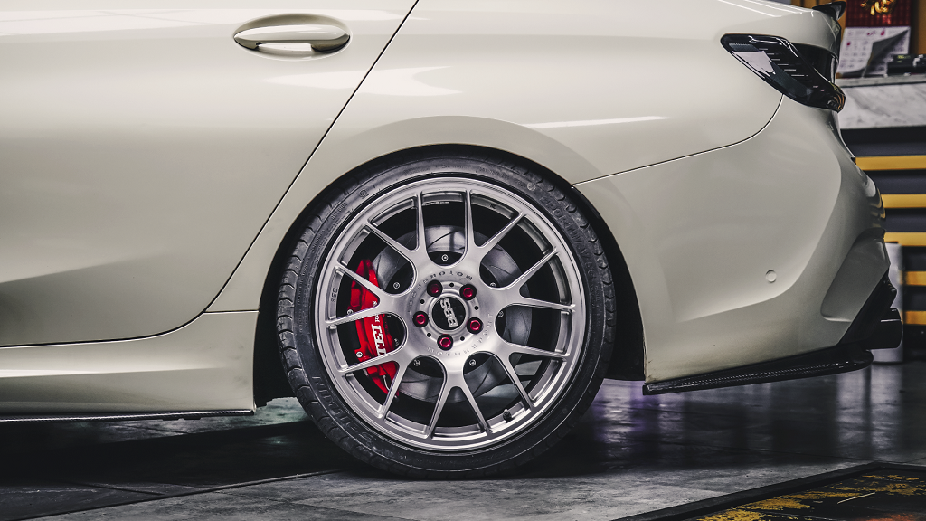 改裝套裝:后輪P4-Explore紅色大四活塞卡鉗,改裝19寸輪轂搭配355x28mm劃線紋分體盤。
