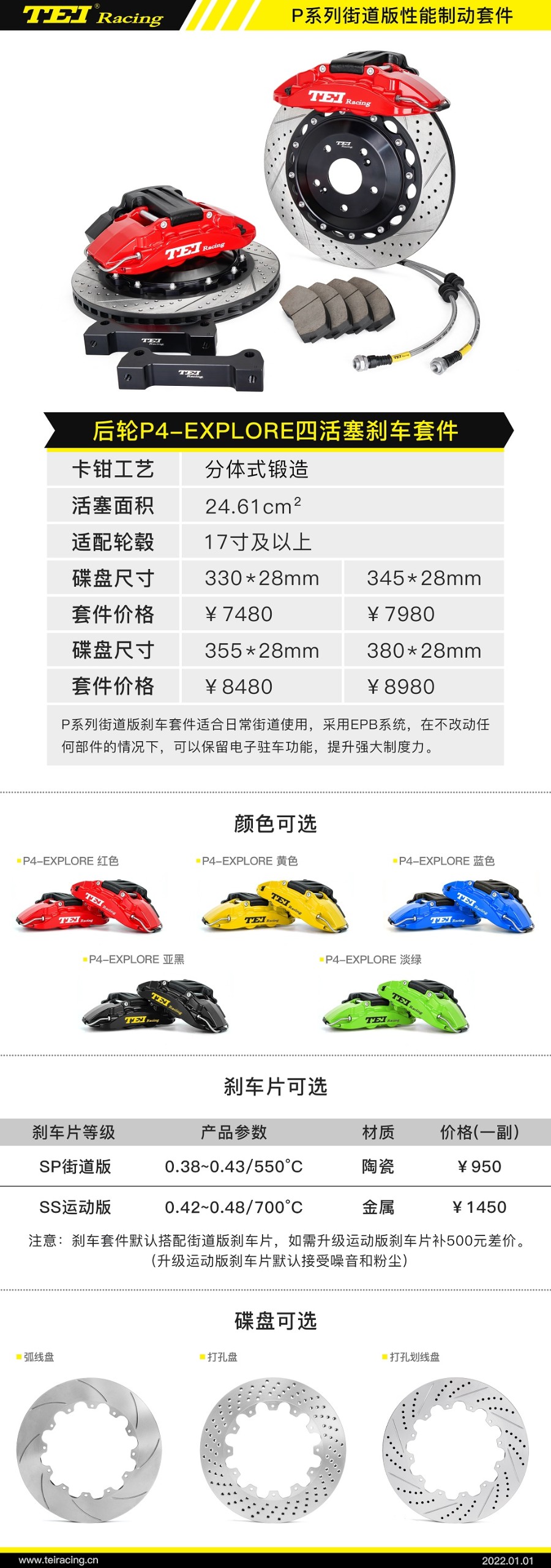 改裝品牌:TEI Racing剎車套件 。(TEI Racing P4-Explore這款是專門為后輪電子駐車系統(tǒng)車型設(shè)計的最新產(chǎn)品,采用EPB系統(tǒng),在不改動任何部件的情況下,可以保留電子駐車功能,提升制動力。一體性更強穩(wěn)定性和安全性更高,安裝便捷。停車功能來自浮動機械設(shè)計,解決市面電子手剎的問題,不必再使用兩個卡鉗結(jié)構(gòu)。電子駐車功能設(shè)計,無需修改任何零件,您也可以保留原廠電子駐車功能,實現(xiàn)強大的制動和便利的電子駐車系統(tǒng)。)