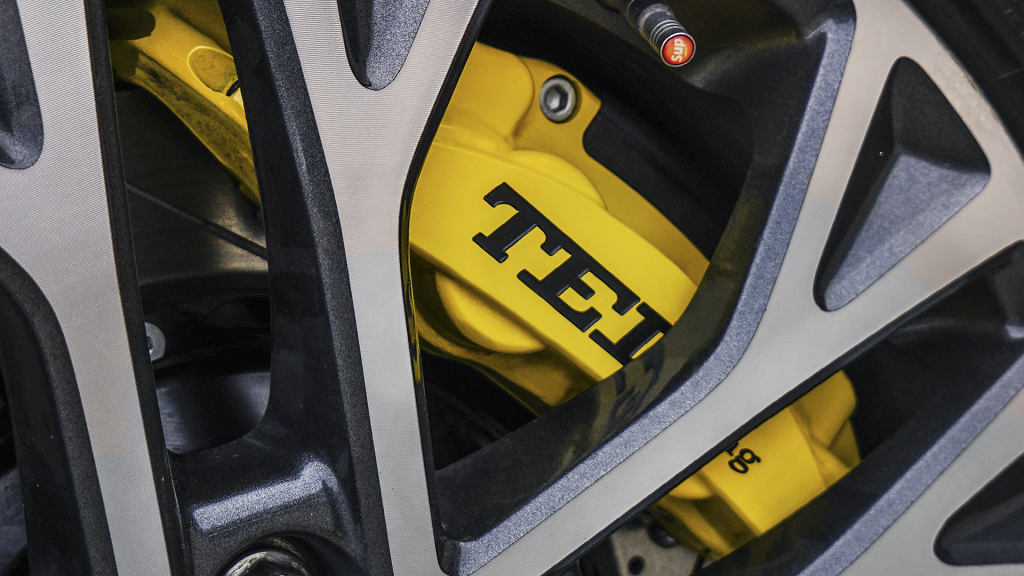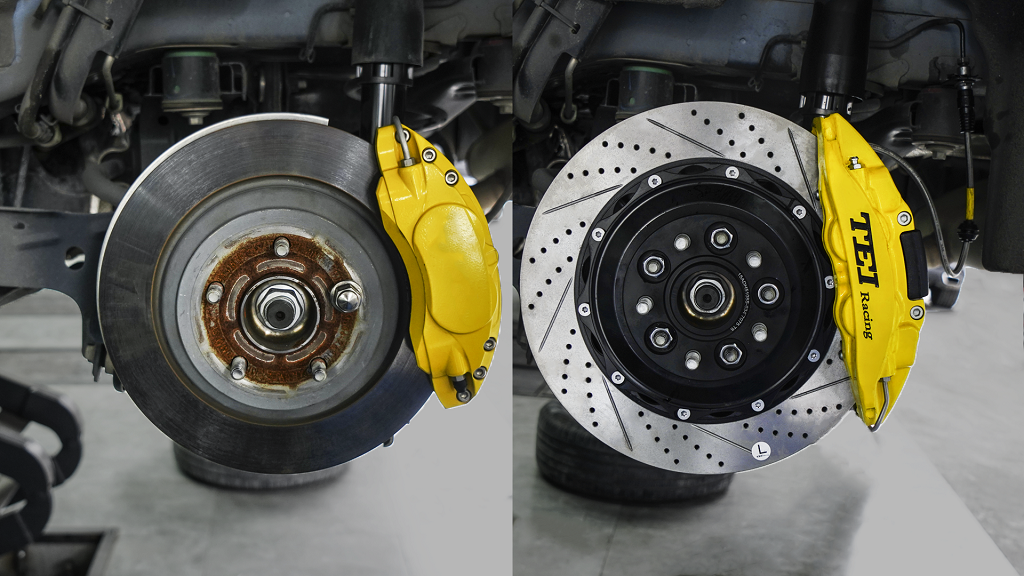 前輪:P40NS+黃色大四活塞卡鉗,搭配355x28打孔劃線分體盤;