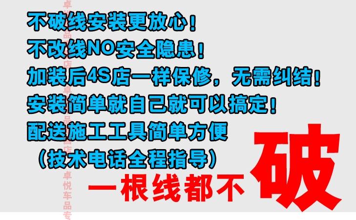 也許有人要問,在原車基礎上加裝升級導航,會不會影響到汽車的原有功能,甚至影響汽車的保修呢?這里我要告訴大家,這次的導航升級采用無損安裝設計,所有連接采用專用插頭對插,不動原車線路,自然不破壞車輛保修,同時,安裝本系統(tǒng)是在原車系統(tǒng)上增加相應的功能,是對原車系統(tǒng)的無縫升級,并采用無損設計,即使本系統(tǒng)失靈,原車系統(tǒng)也不受任何影響。聽到這里,大家是否心動了呢,