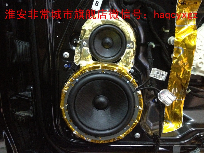 安裝前聲場(chǎng)JBL6563C三分頻喇叭的中音單元和中低音單元,還是安裝在原來(lái)的位置,先用高密度板制作一個(gè)邁騰專(zhuān)用的喇叭墊,做好防水處理,不破壞原車(chē)門(mén)板結(jié)構(gòu),方便以后復(fù)原,中音和中低音呈葫蘆軸線(xiàn)形狀安裝,聲場(chǎng)均衡,有利于中頻段與低音頻段的銜接
