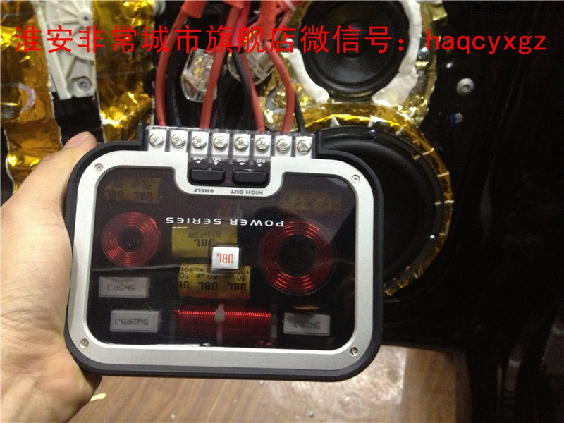 后聲場(chǎng)JBL二分頻開(kāi)始安裝,中低音喇叭安裝在原來(lái)的位置,采用有機(jī)塑料制作的大眾專(zhuān)用喇叭墊,旁邊安裝的是JBL二分頻的分頻器