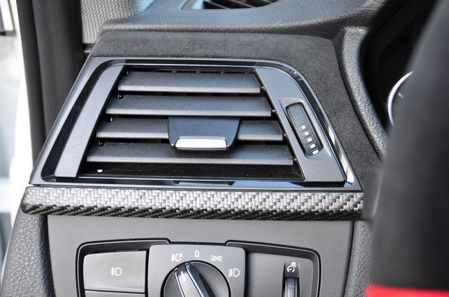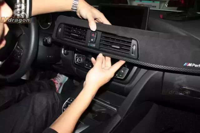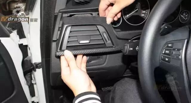 駕駛位空調(diào)出風(fēng)口上半部采用翻毛材質(zhì),下半部使用碳纖維材質(zhì)
