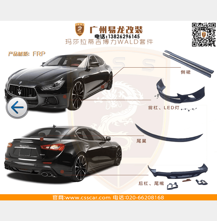 瑪莎拉蒂吉博力改WALD套件 材料:FRP 包括:前杠 后杠 側(cè)裙 尾嘴 尾翼 LED燈 公司網(wǎng)址:www.csscar.com 公眾微信號:csscar 手機(微信):13826296145 扣扣:2093397277 瑪莎拉蒂吉博力改WALD套件