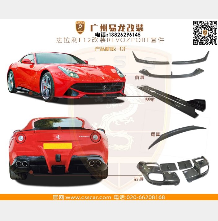 法拉利F12改REVOZPORT套件 材料:CF 包括:前唇 后唇 側(cè)裙 尾翼 公司網(wǎng)址:www.csscar.com 公眾微信號(hào):csscar 手機(jī)(微信):13826296145 扣扣:2093397277 法拉利F12改REVOZPORT套件