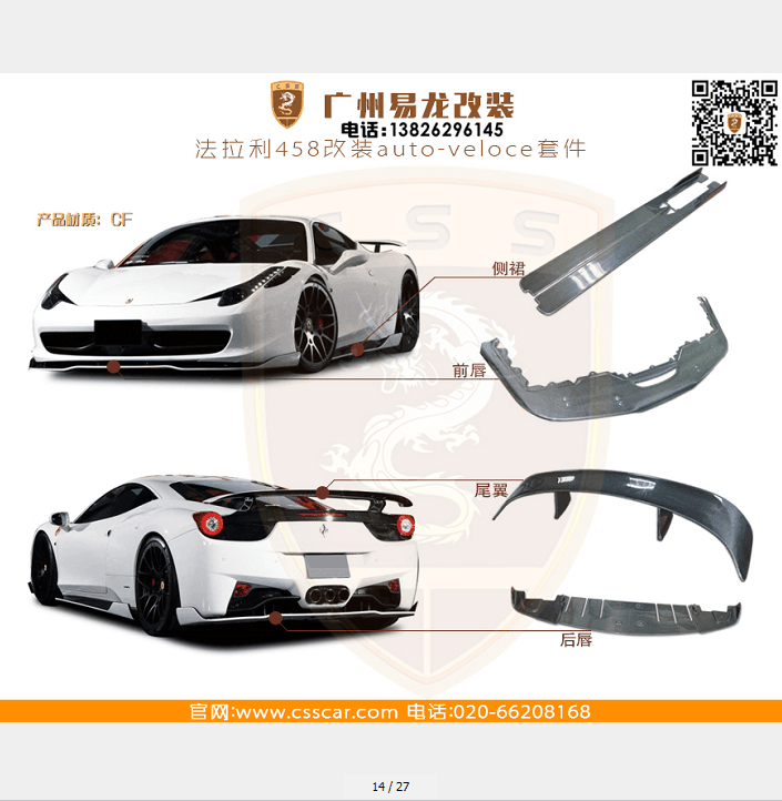 法拉利458改AUTO-veloce套件 材料:CF 包括:前唇 后唇 側(cè)裙 尾翼 公司網(wǎng)址:www.csscar.com 公眾微信號(hào):csscar 手機(jī)(微信):13826296145 扣扣:2093397277 法拉利458改AUTO-veloce套件