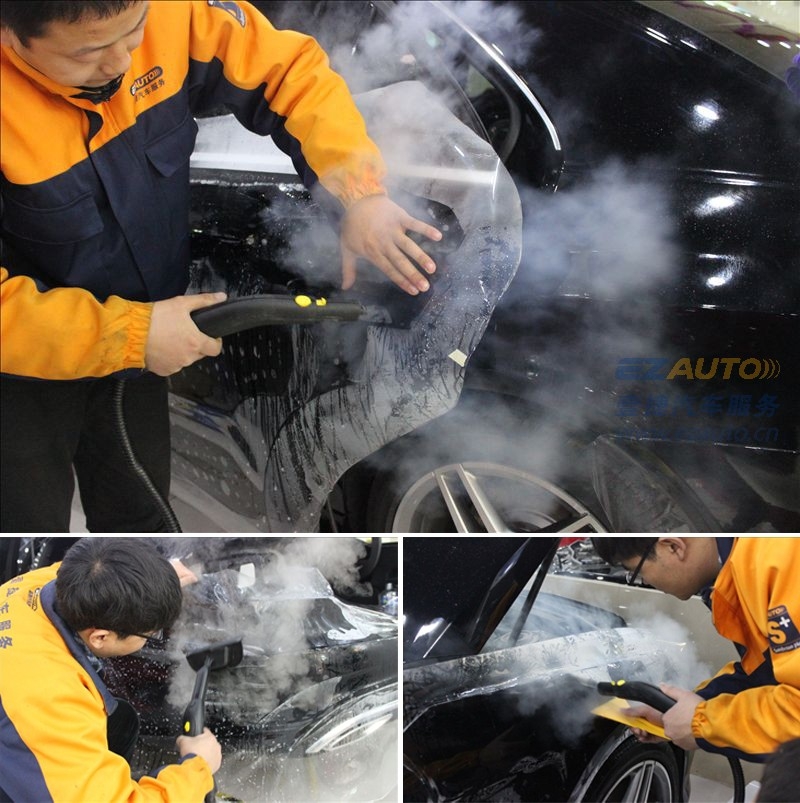 奔馳E260L貼汽車透明保護(hù)膜用蒸汽機(jī)進(jìn)行烤膜施工