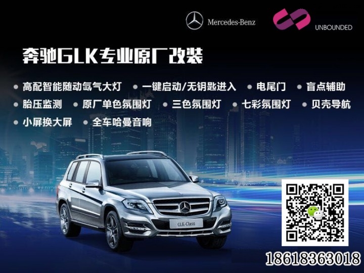 奔馳GLK原廠改裝: 1.高配智能隨動氙氣大燈 2.一鍵啟動/無鑰匙進入 3.電尾門 4.盲點輔助 5.胎壓監(jiān)測 6.原廠單色氛圍燈 7.三色氛圍燈 8.七彩氛圍燈 9.貝殼導航 10.小屏換大屏 無界客戶溫馨提示:關注無界的車友 ...